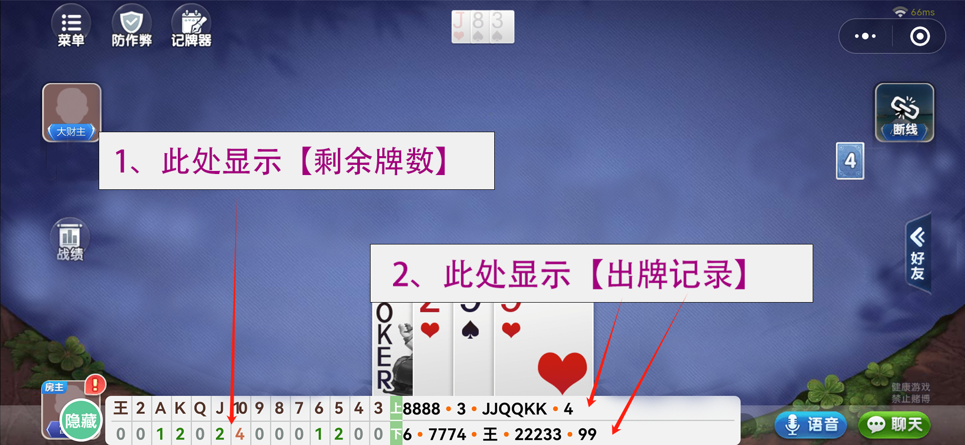 该记牌器是安卓、苹果手机专用的记牌器,通用于多种游戏平台的斗地主、跑得快、510K、双扣、刨幺等扑克游戏。大厅游戏、好友开房间都可以使用。